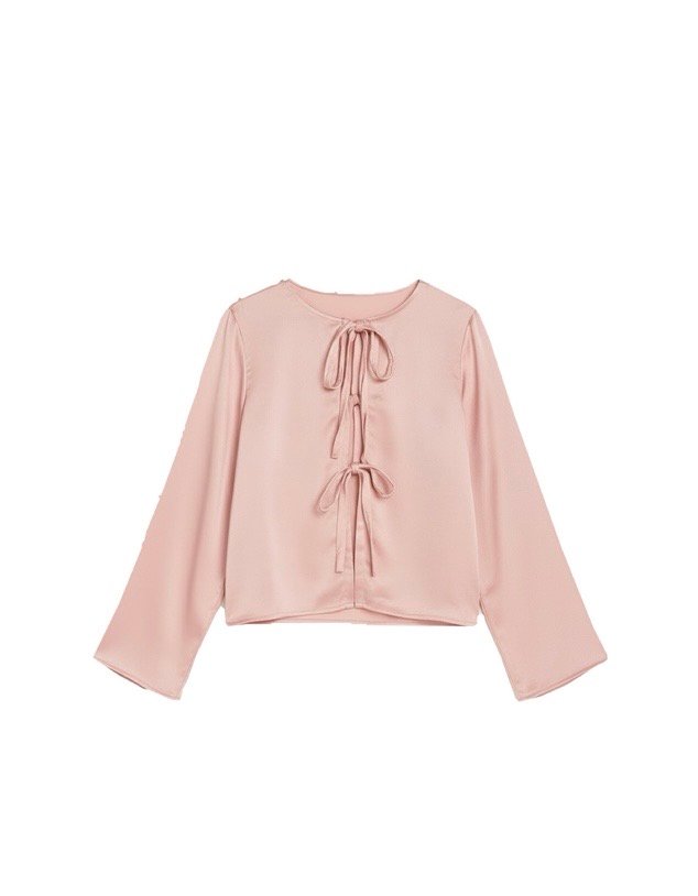 This elegant blush top features delicate front bow tie details that add a soft, feminine touch to a minimal silhouette. Designed with a relaxed fit and full sleeves, it offers both comfort and effortless style.