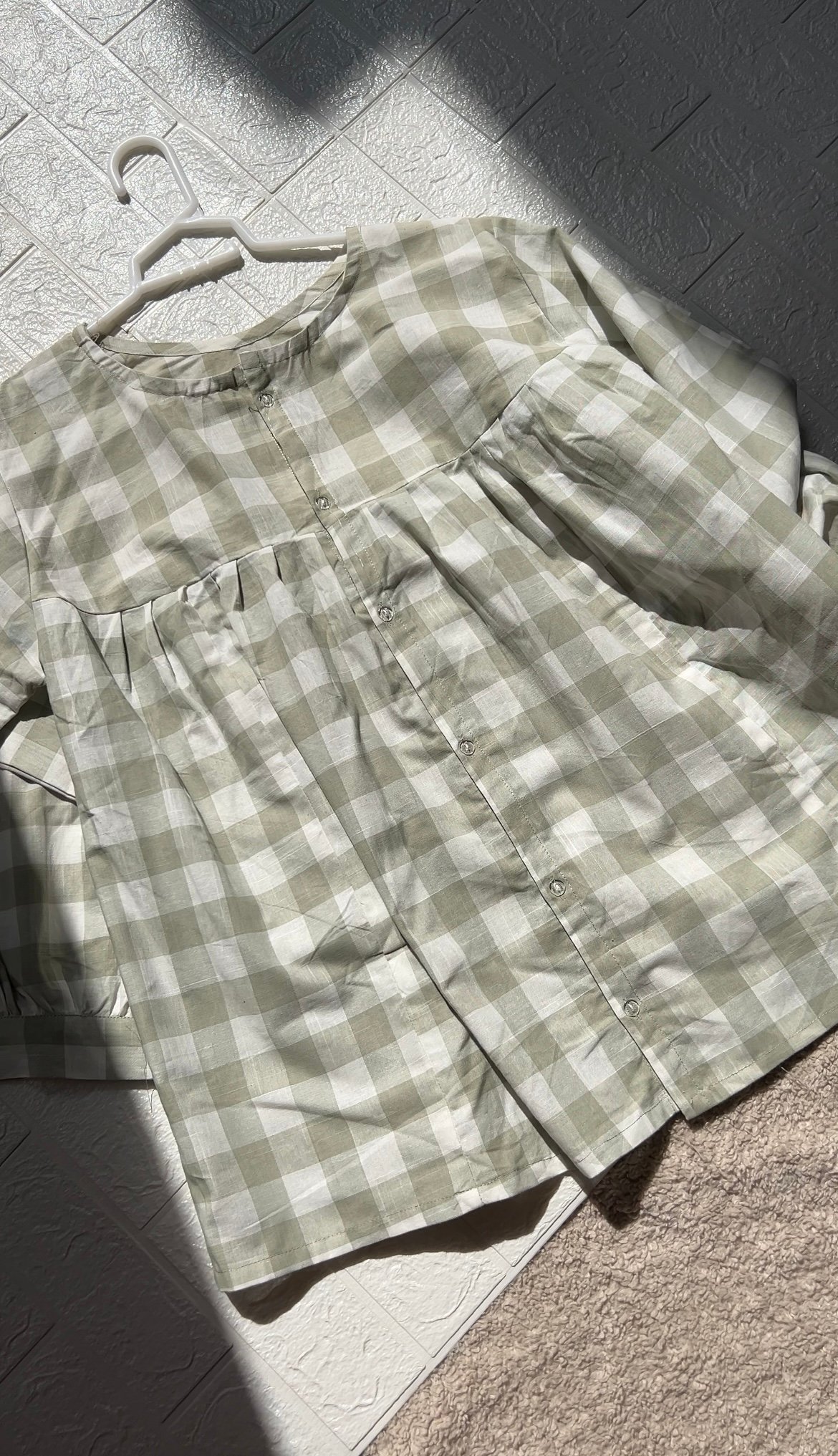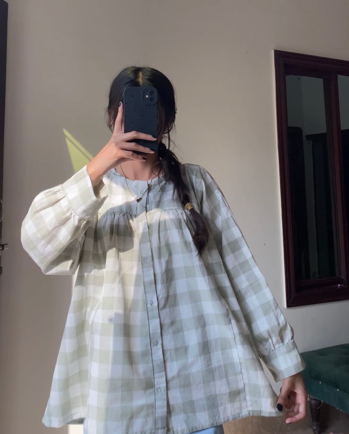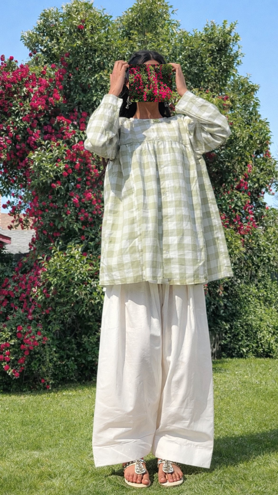 Effortless charm meets everyday comfort in our Green check top. Perfect for a relaxed yet polished look, this kurti is made from soft, breathable cotton featuring a timeless, large-scale sage green and white gingham check pattern.