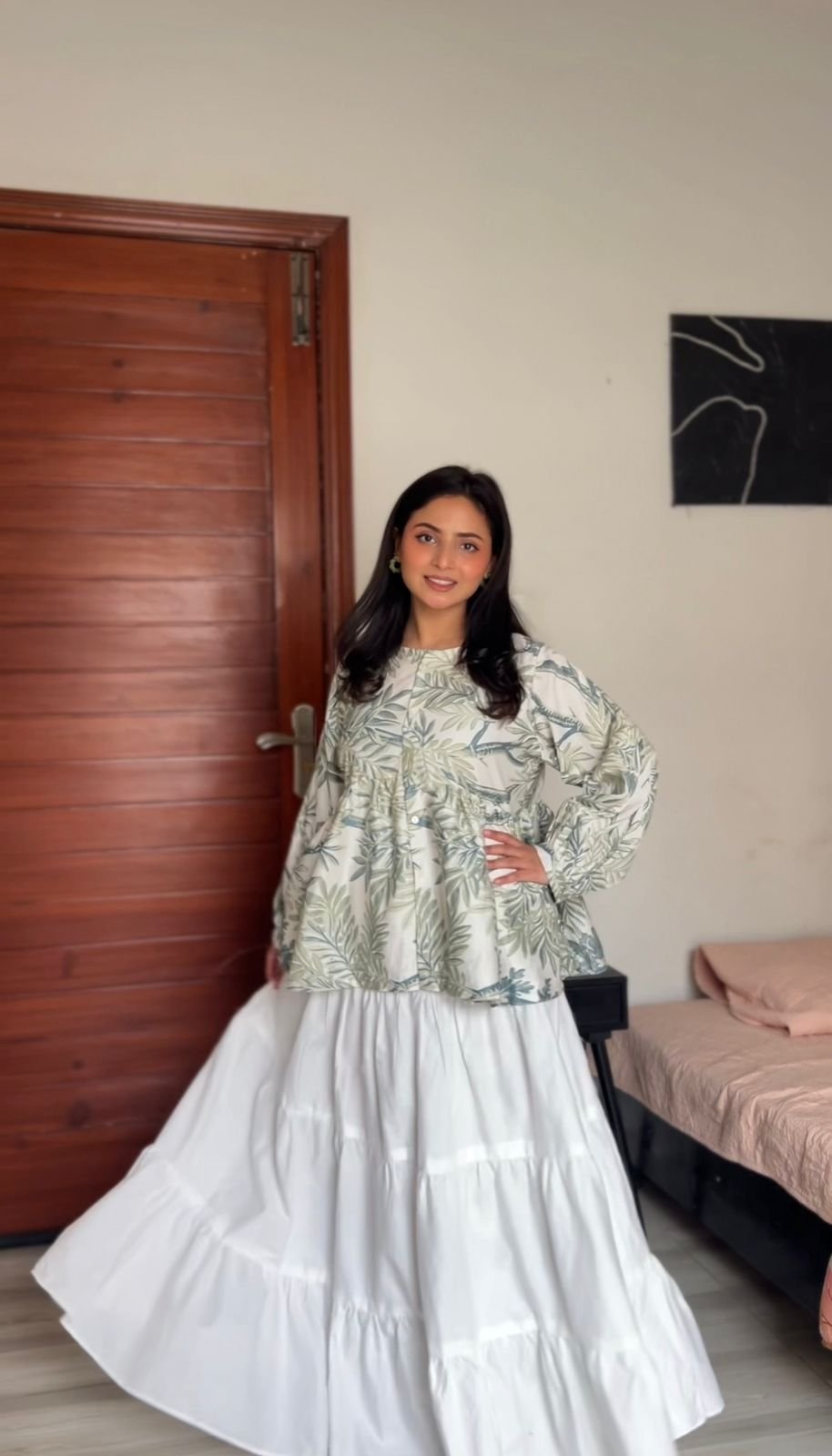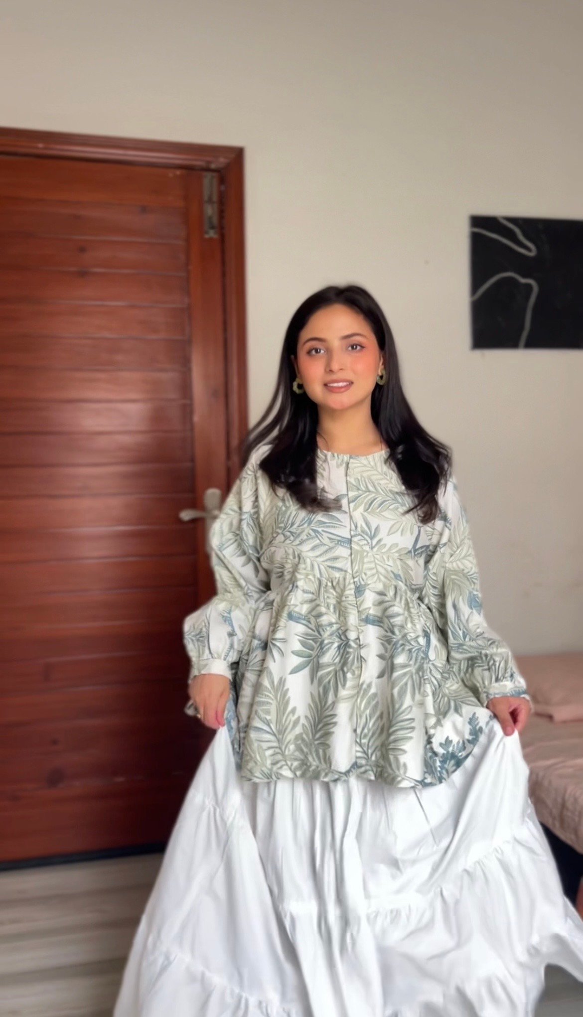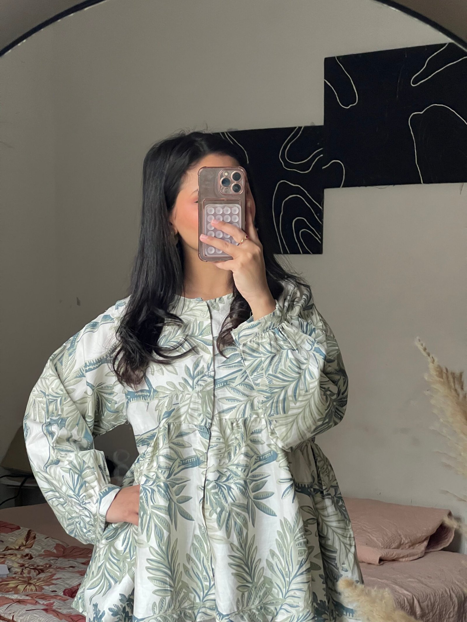 Featuring a delicate, muted print of sage green and slate blue leaves on a crisp white background , this top offers a comfortable and effortlessly chic look.