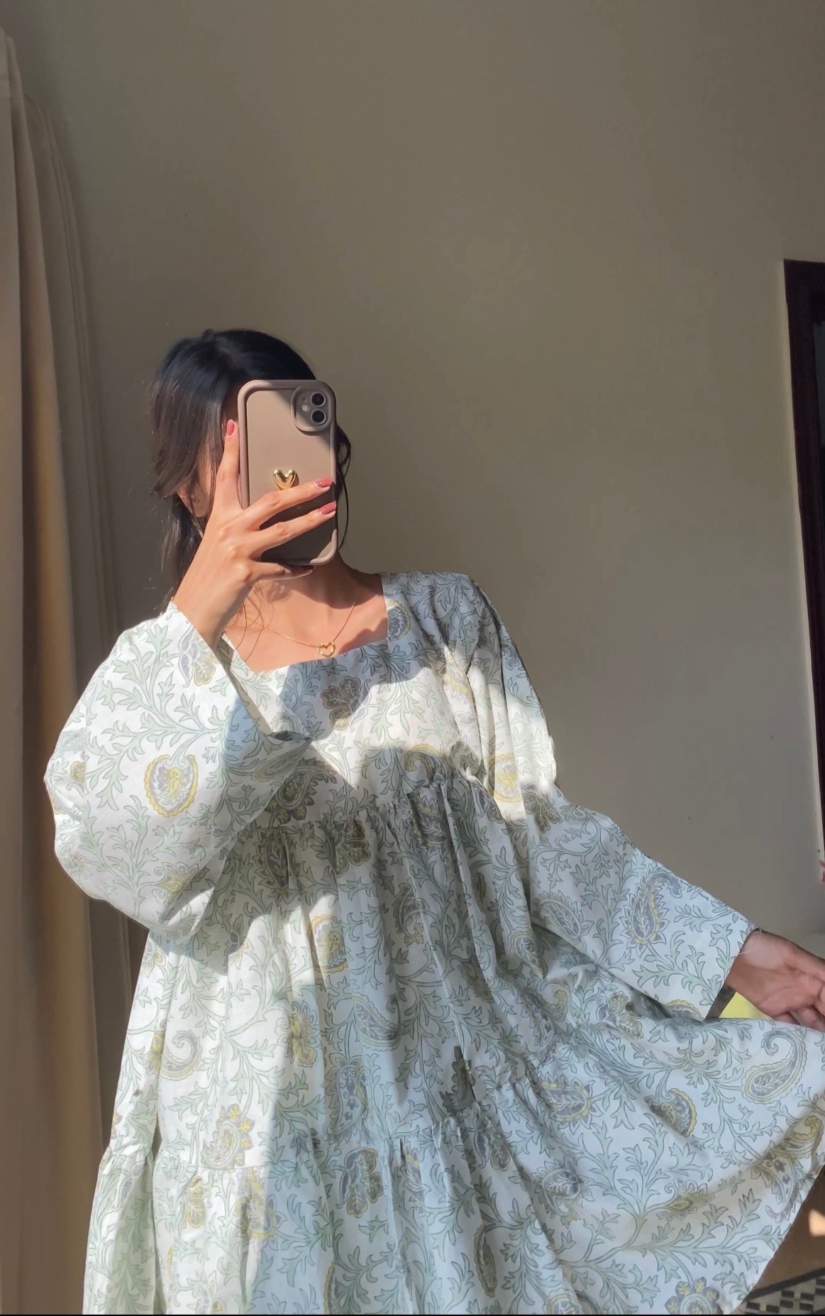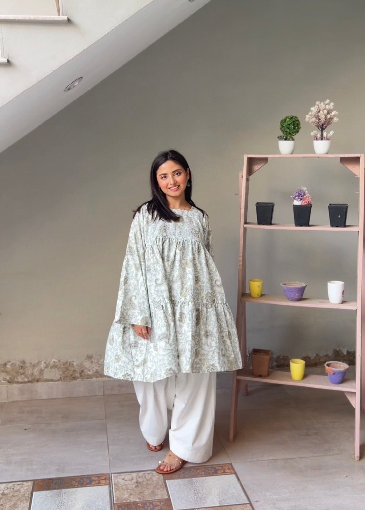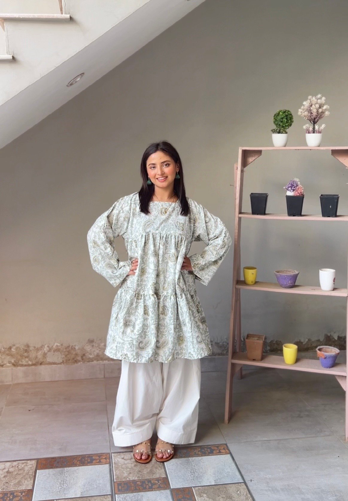 A timeless pastel kurti designed for comfort and effortless sophistication. Crafted in a lightweight breathable fabric, adorned with delicate paisley floral motifs in soft sage tones, this piece gives a calm and refined look.