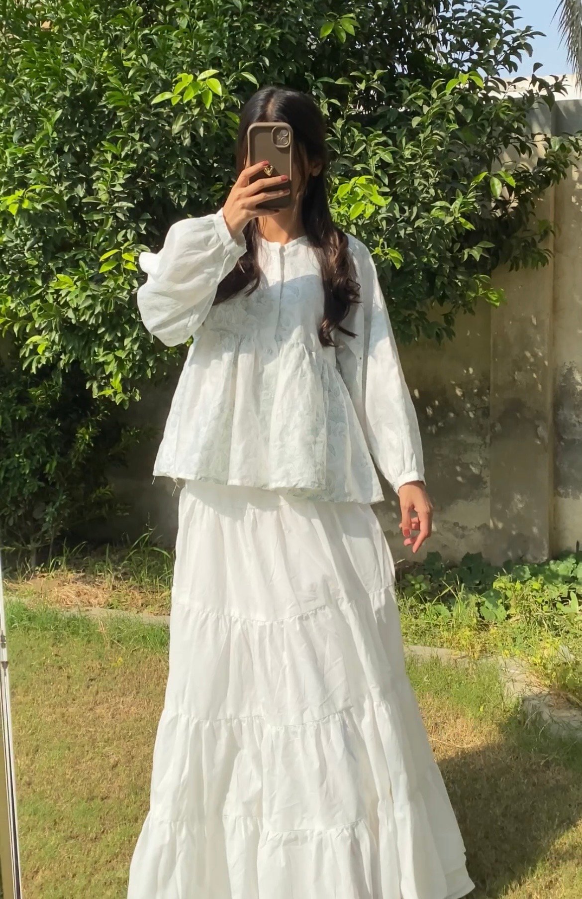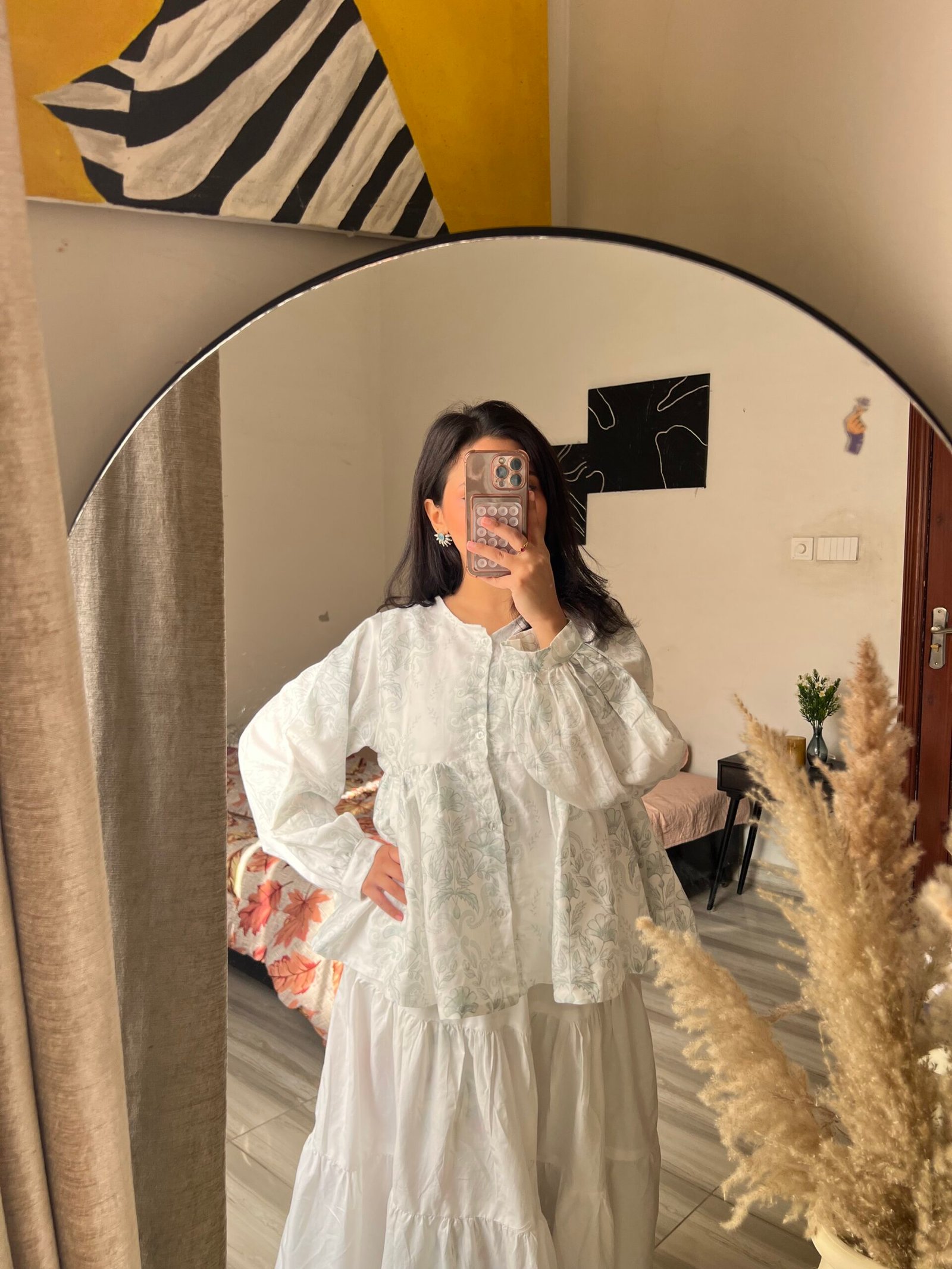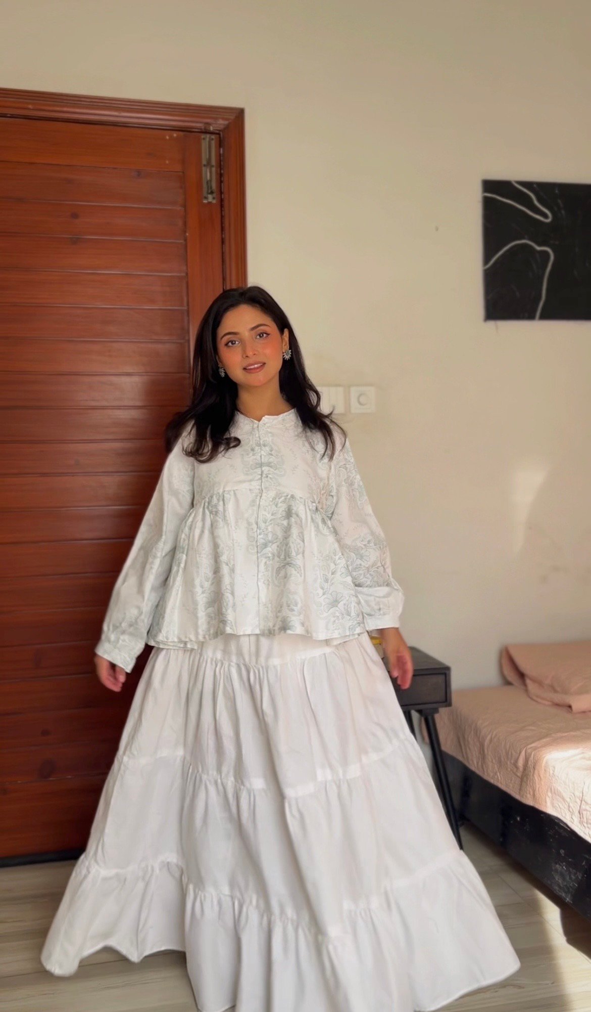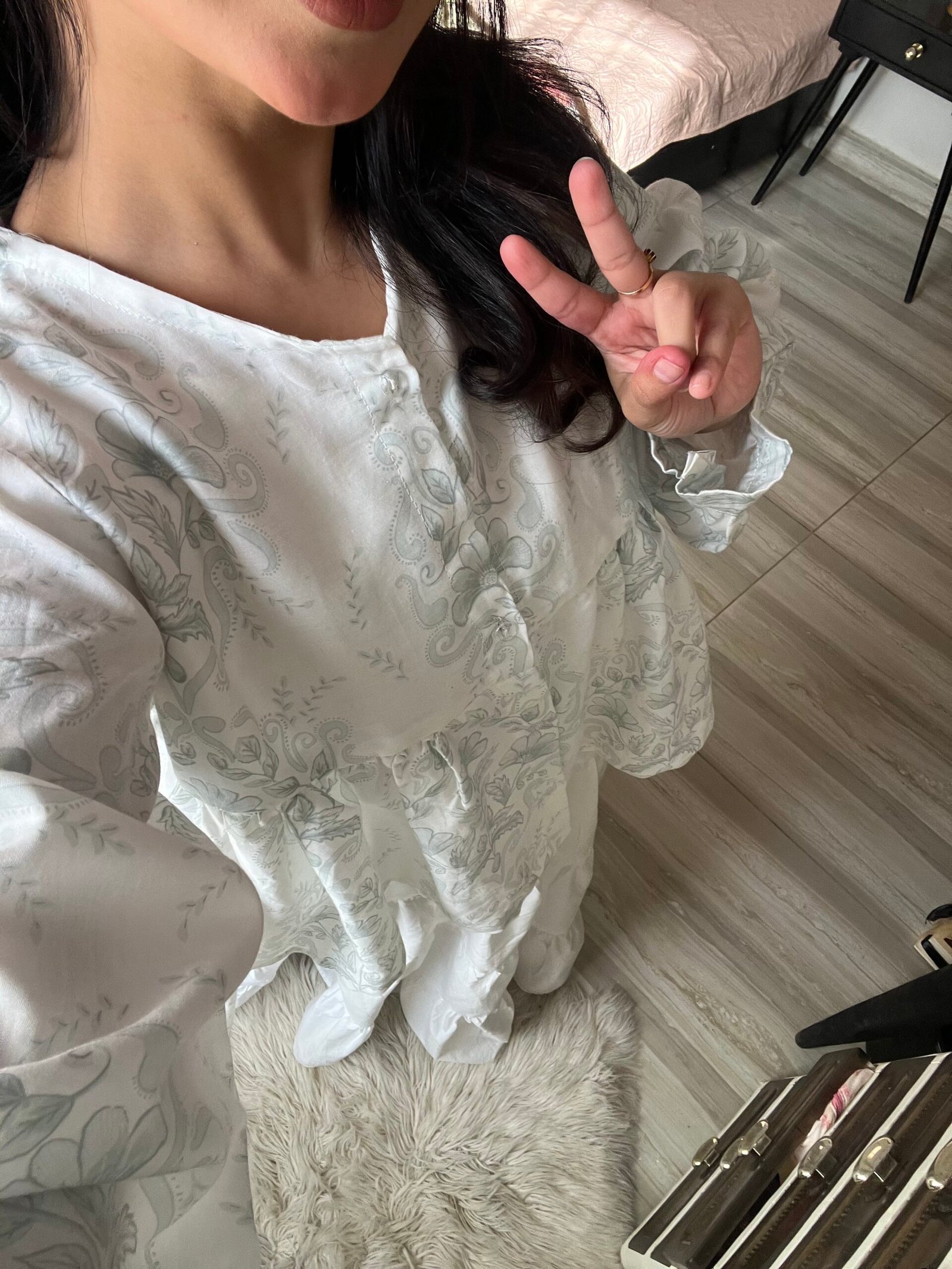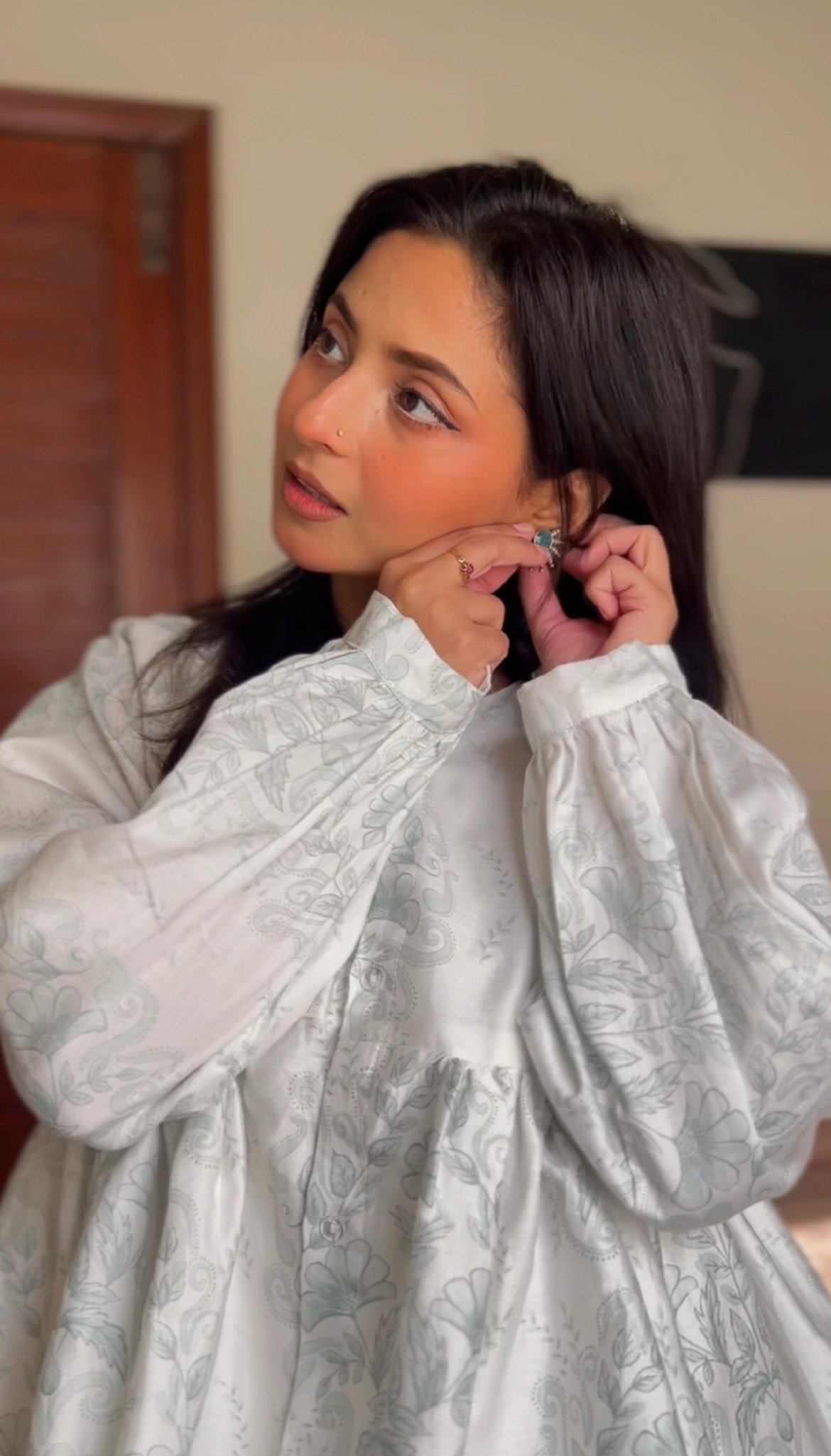 This elegant pastel printed mint top features a soft mint and powder-blue palette with a flowy babydoll silhouette. Designed with cufffed sleeves and a gathered waist, it offers a relaxed, modest fit that feels light and comfortable all day.