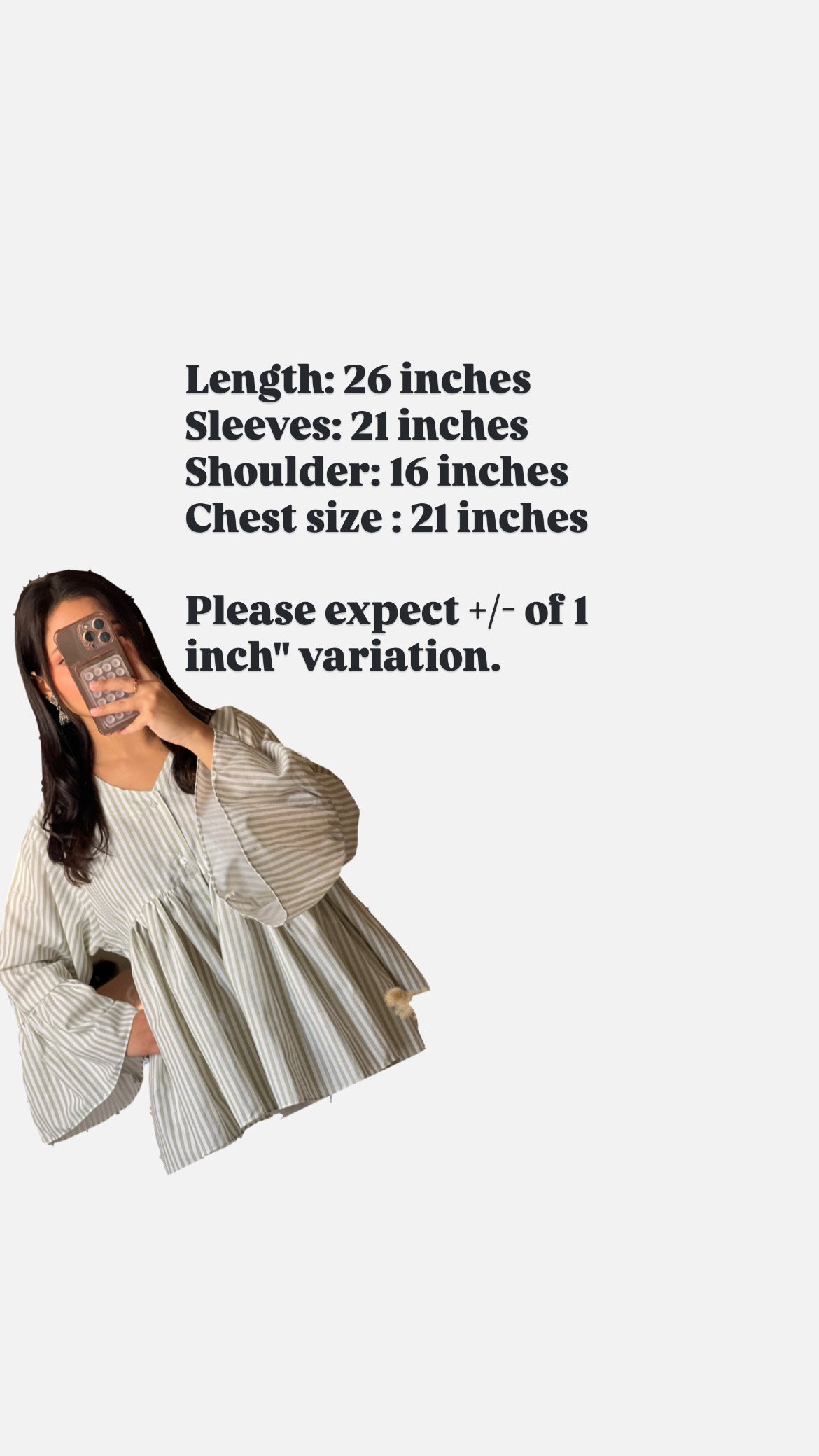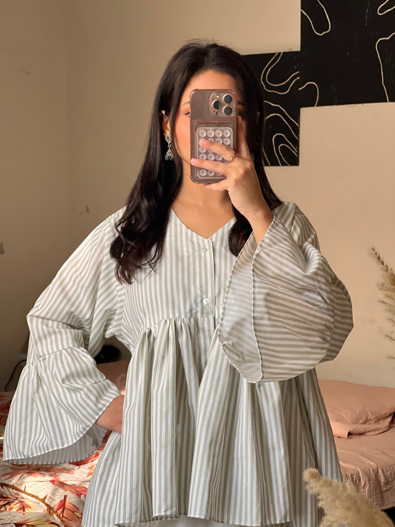 This elegant striped babydoll top features a soft sage and white color palette with a relaxed, flowy silhouette. Designed with wide statement sleeves and a buttoned neckline, it offers a modest yet modern look.