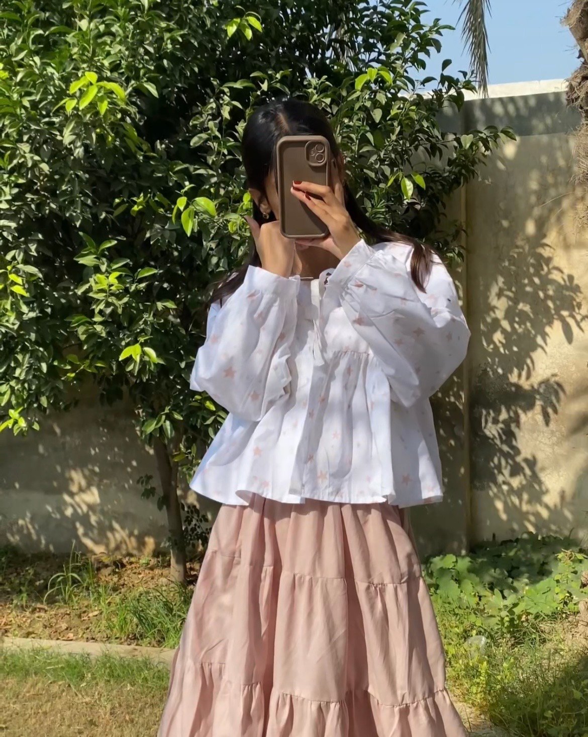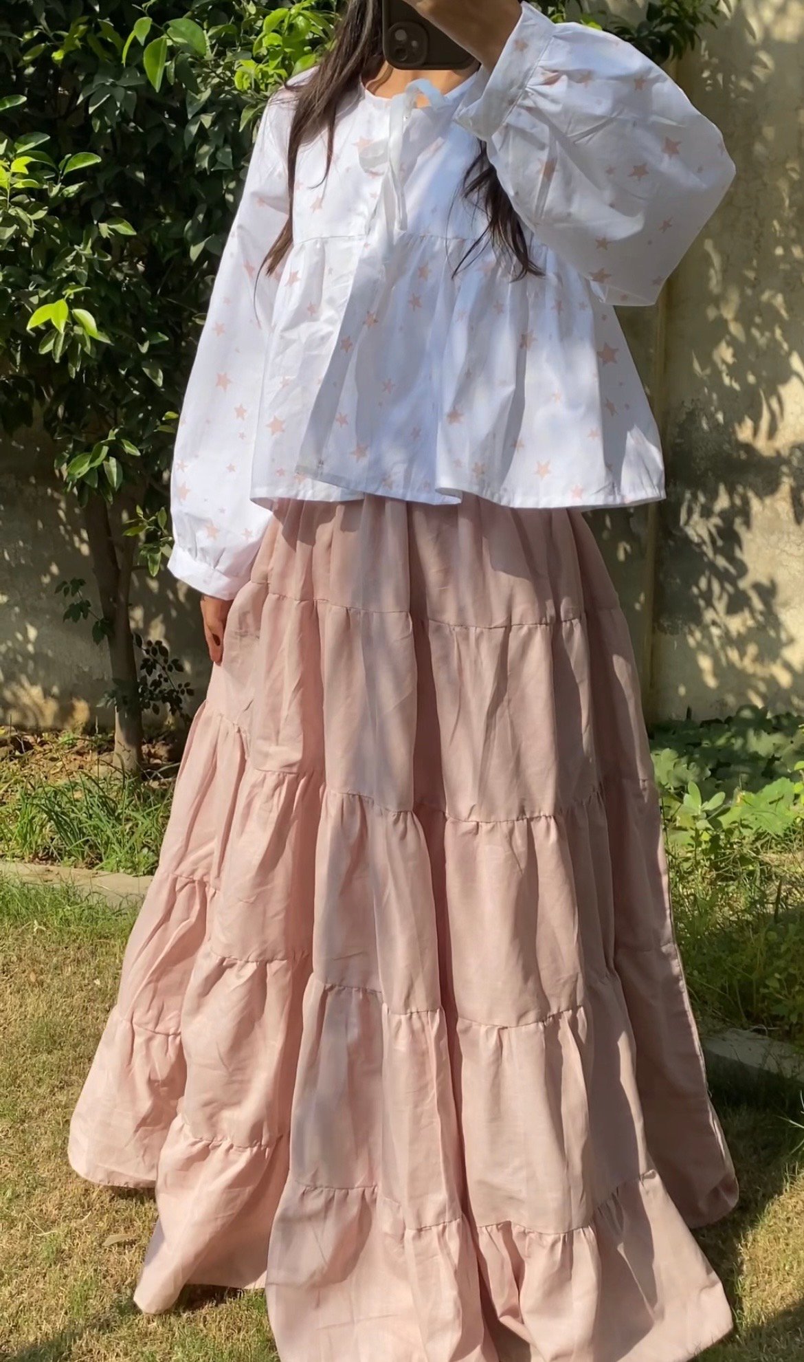 This graceful pink star-print top is designed to bring a soft, dreamy charm to your everyday wardrobe. Crafted from lightweight, breathable fabric, it features a relaxed peplum silhouette with a gently gathered waist that offers a flattering and modest fit.