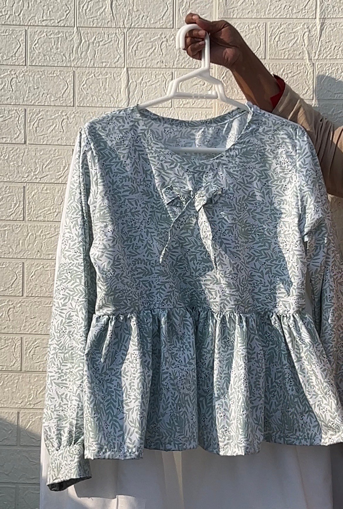 A soft breathable satin cotton peplum top featuring a delicate botanical print and front tie-up neckline. Designed for comfort and effortless everyday elegance, making it a perfect choice for warm weather wear.
