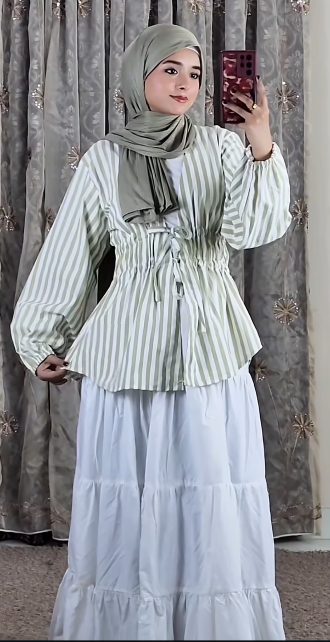 This beautifully tailored striped top features a flattering tie-waist detail that enhances the silhouette while maintaining a modest, comfortable fit.
