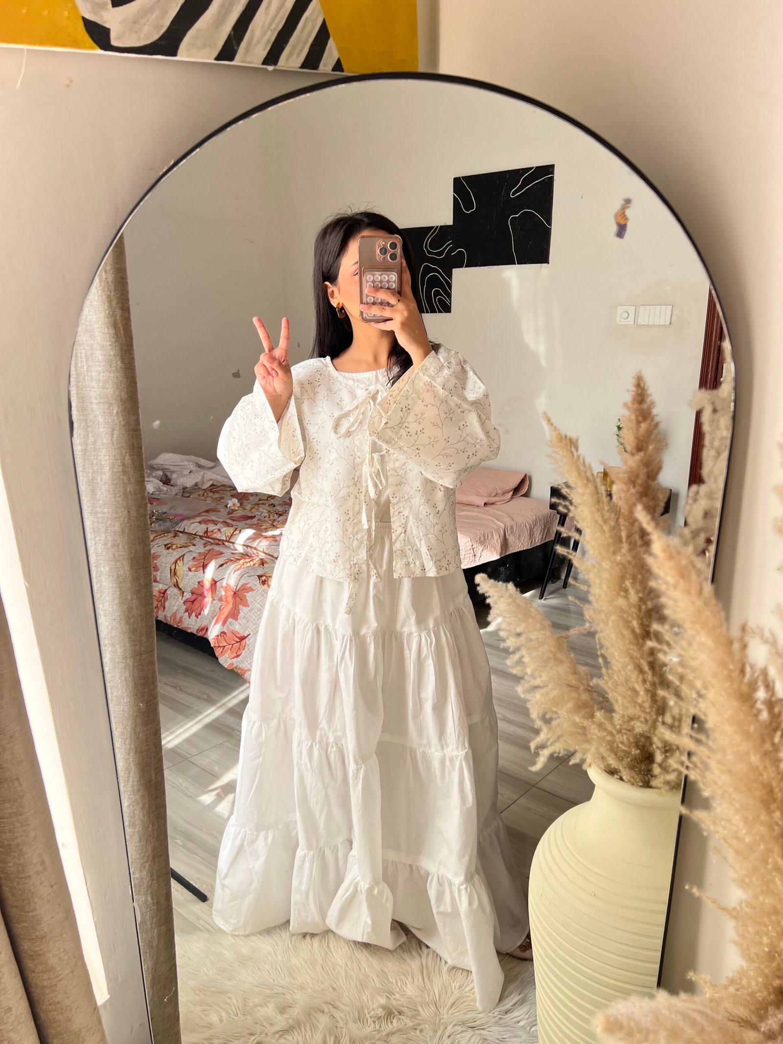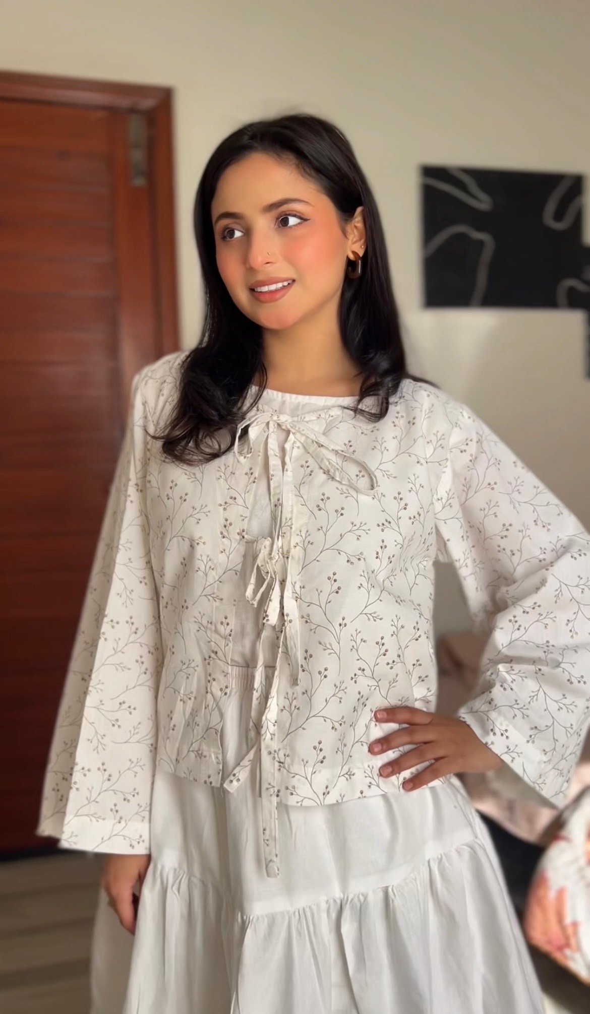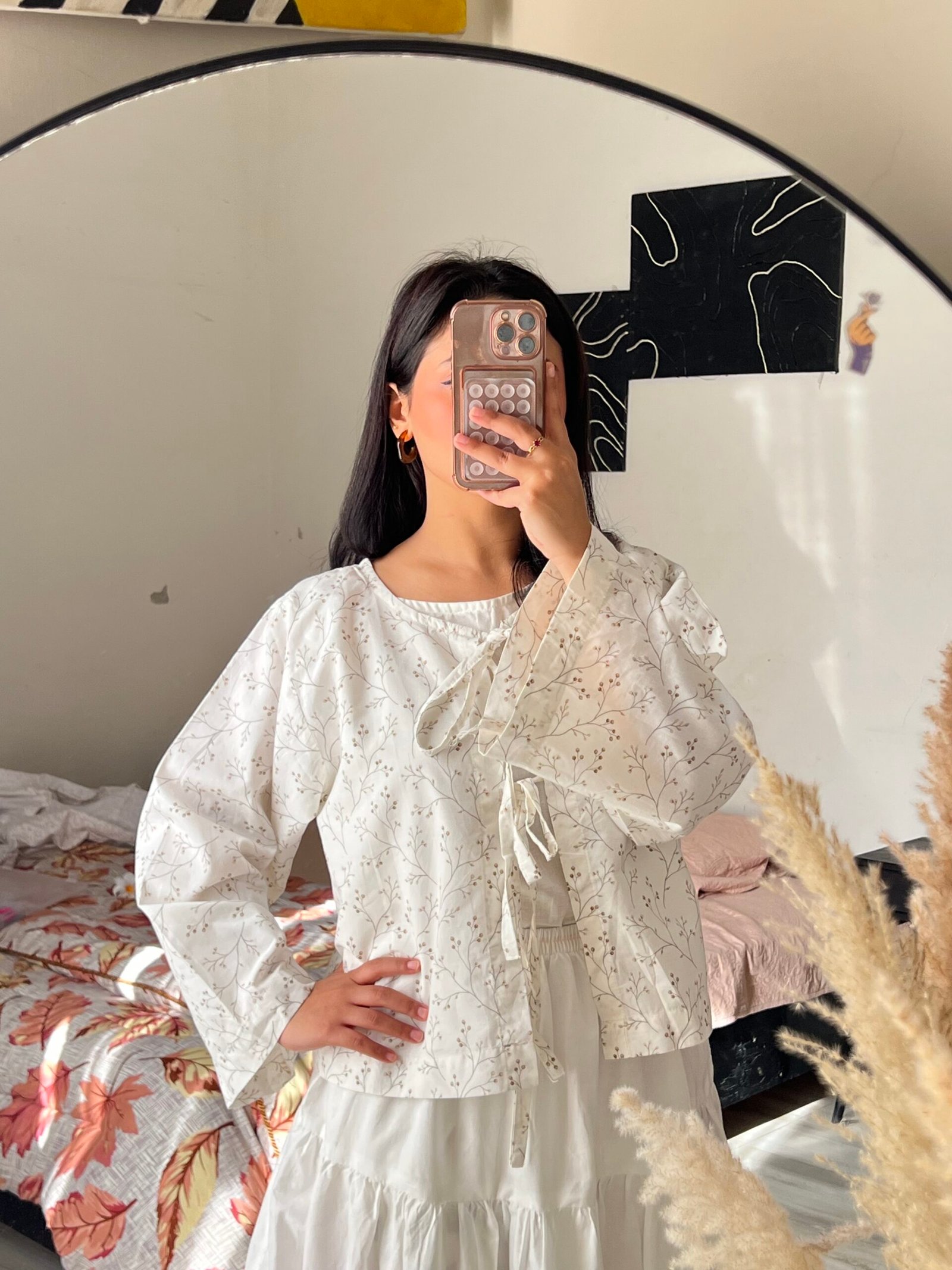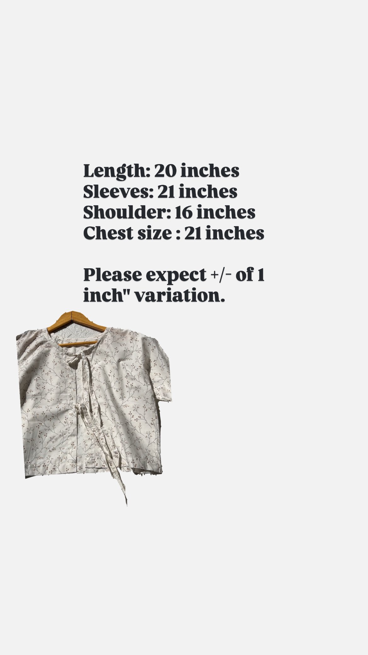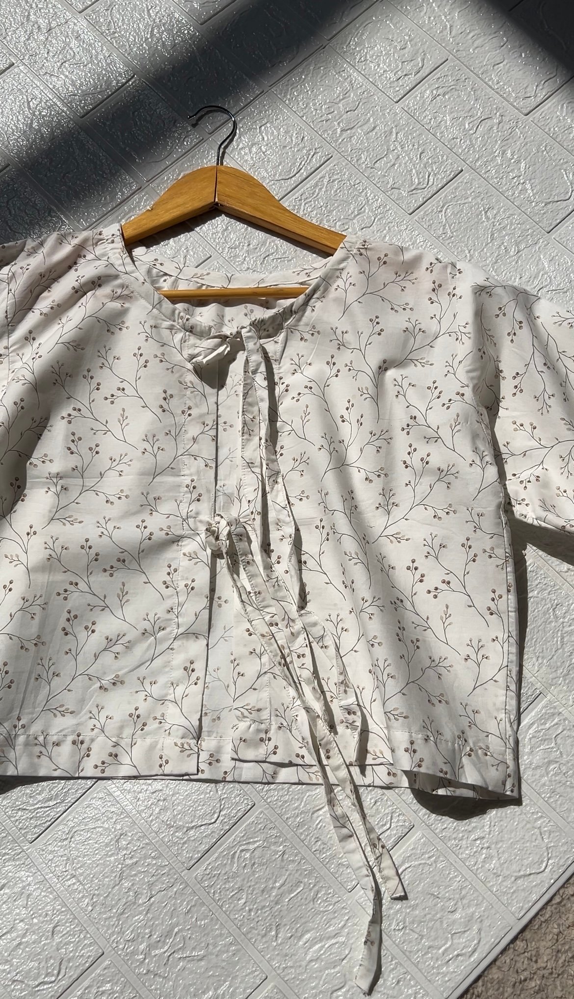 Made from a crisp, light-colored (likely off-white or cream) cotton or cotton blend fabric, featuring a beautiful, subtle miniature botanical print. The print consists of fine, scattered stems and leaves in a neutral tone (taupe or light brown), giving it an airy, organic feel.